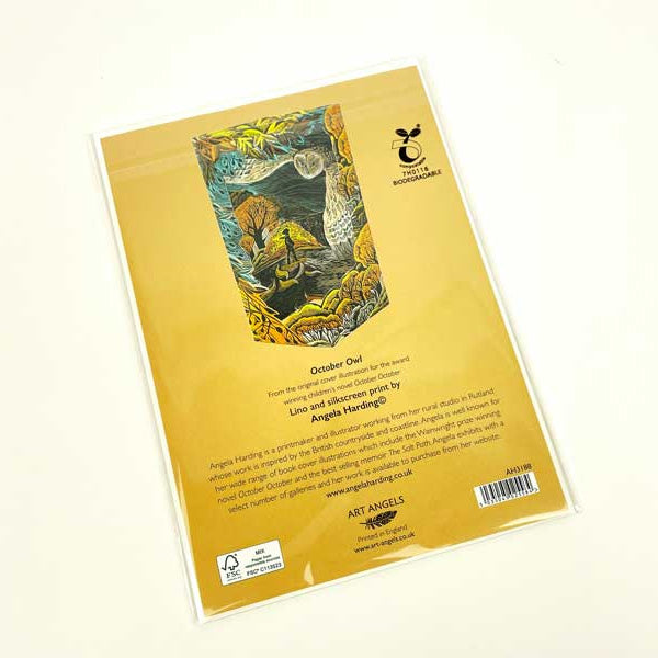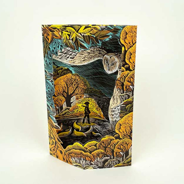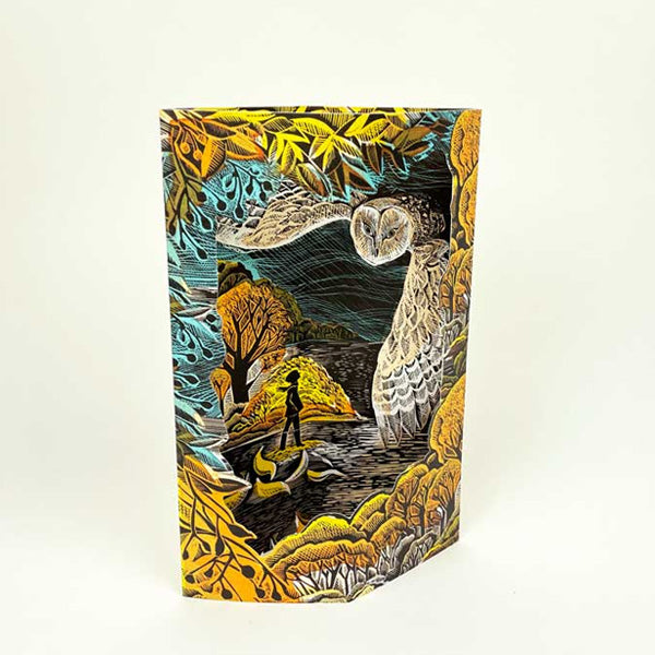 A lovely card to send to countryside lovers; the die-cut Art Angels Angela Harding October Owl 3D Card can be sent as a birthday, thank you or just because card. Open along the fold lines to pop open and make an attractive free-standing 3D card of an owl swooping over an autumnal countryside scene. From the original lino and silkscreen prints by the illustrator, Angela Harding.