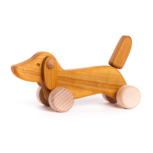 This delightful wooden dachshund puppy is full of character and ready for playtime. Lovingly crafted for little hands, it glides smoothly across any surface, and as it rolls, its floppy ears waggle, bringing joy and giggles in its wake. This pup is more than a toy, it’s a loyal little friend that encourages movement, storytelling, and hours of cheerful play.
