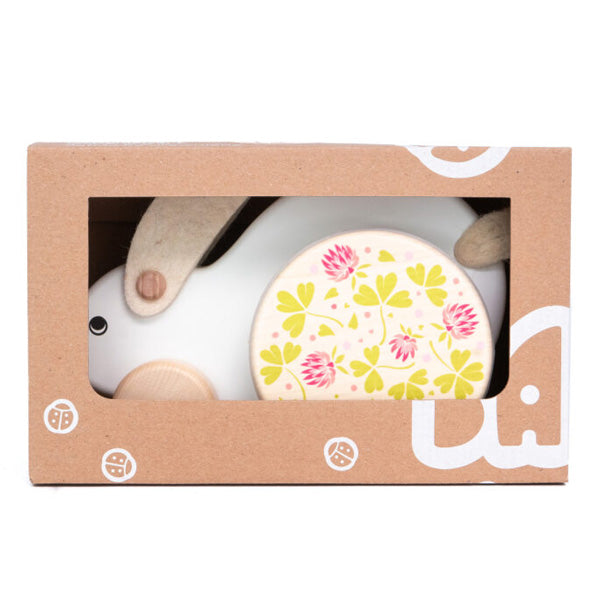This beautifully crafted wooden rabbit is a timeless pull along companion for babies and toddlers finding their feet. As your little one pulls it along by the cord, the clever design brings the back wheels to life with a delightful hopping effect. Made in Poland from sustainably sourced wood and finished with non-toxic, eco-certified paints, this bunny is as safe as it is charming. With soft felt ears that invite gentle stroking and wheels adorned with pretty clover leaf and flower motifs, this toy offers a delightful sensory experience for curious little hands. Ideal for early walkers, the rabbit helps build confidence, balance, and coordination through active, imaginative play.
