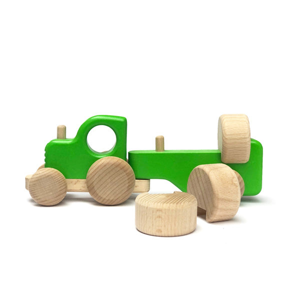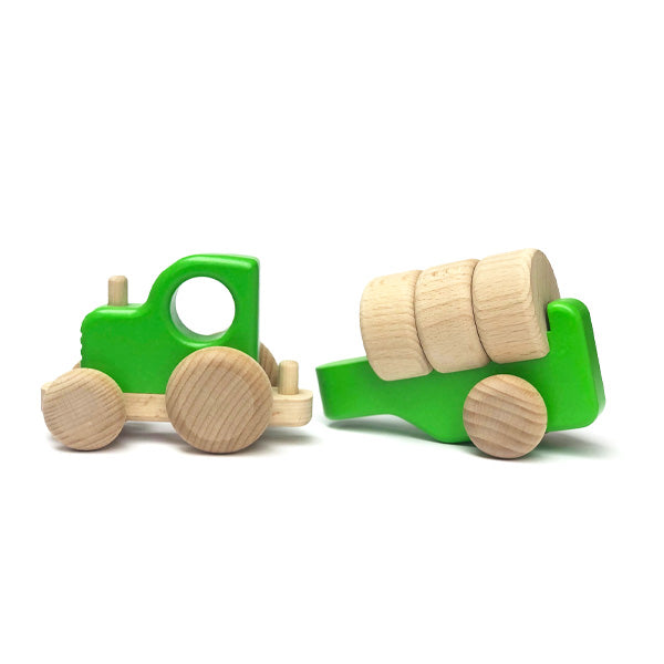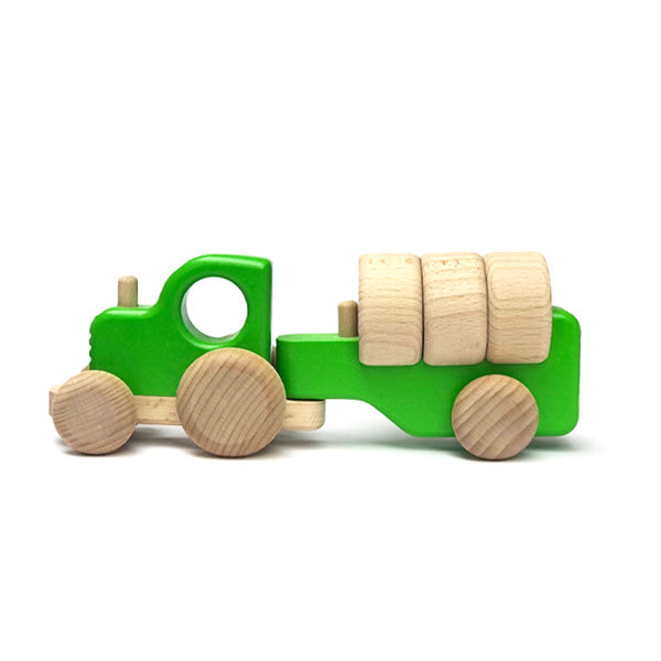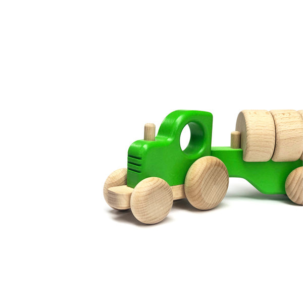 Chug chug... Perfect for your little farmer, this splendid green tractor and trailer with wooden bales is made from sustainably sourced European wood and painted with child-friendly, non-toxic paints that are even safe for chewing. Ergonomically designed for little hands to push, steer, load, unload, stack and unstack. Wonderfully tactile, they are perfect for open-ended play.
