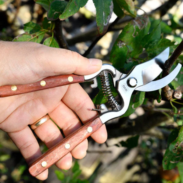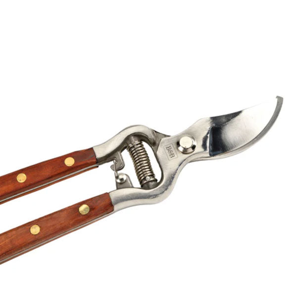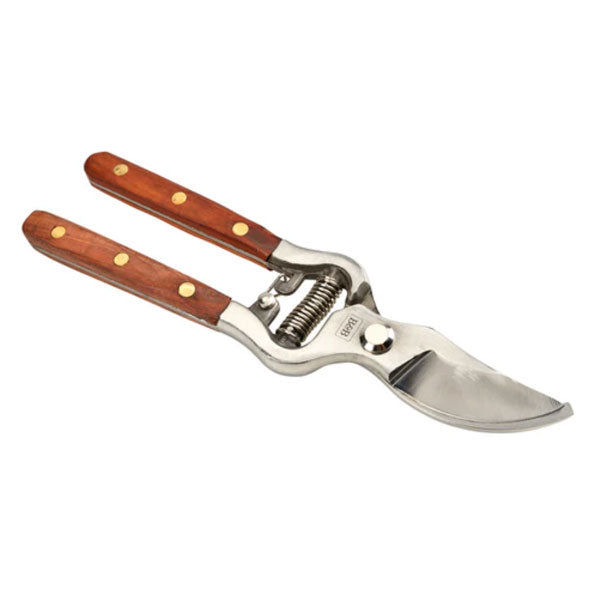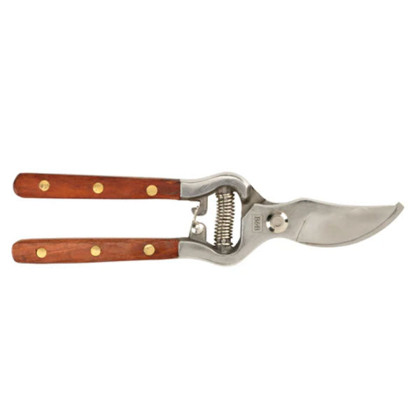 A stainless steel bypass secateur from Burgon & Ball's Estate Range collection. The stainless steel of this bypass secateur has been drop forged, a manufacturing process which removes any voids and aligns the grain of the metal for a tool of outstanding strength and enduring sharpness. The all-steel construction also adds strength, as the single-piece steel of the blades extends the whole length of the handles. The stainless steel is rust resistant, making the blades easy to keep clean and minimising corrosion. The bypass action is ideal for making the precise, clean cuts which are better for plant health. Solid brass rivets fasten the stylish FSC® hardwood handles, for a touch of classic style.