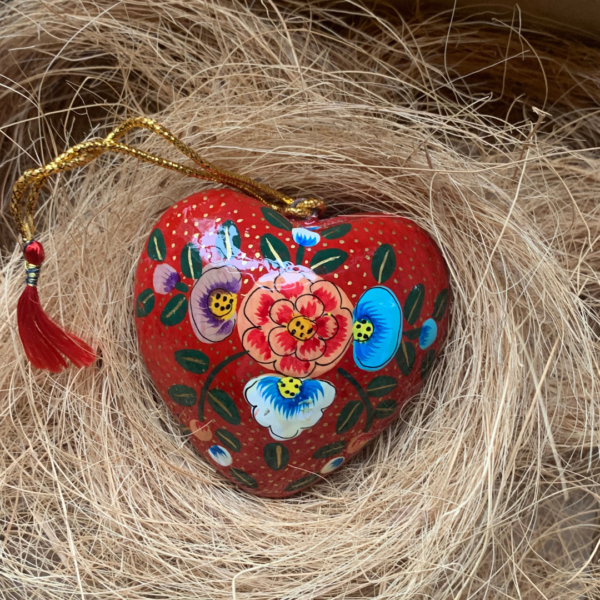 This delightful Red Floral Heart Christmas decoration is individually handmade using papier-mâché and hand painted with traditional Kashmiri designs. Designed to last for many Christmases to come, it’s both durable and beautifully detailed, perfect for adding a touch of handcrafted character to your seasonal decorations. A thoughtful choice for eco-conscious celebrations this single decoration is approx 3″ and is crafted with care and conscience from ethical sourcing and sustainable practices.