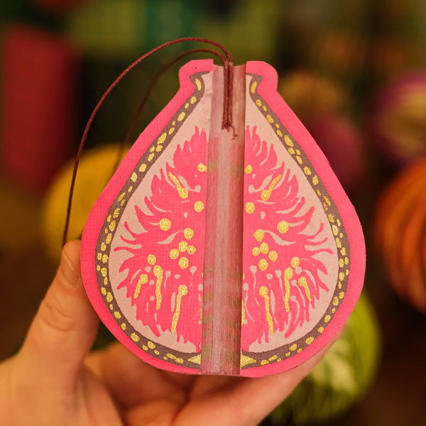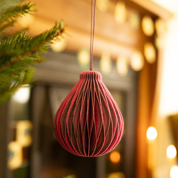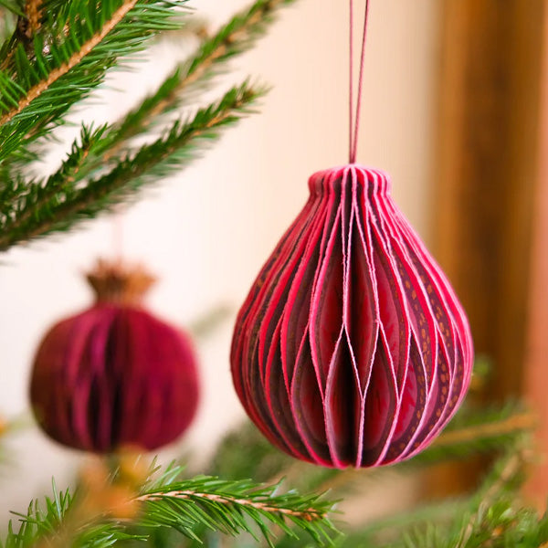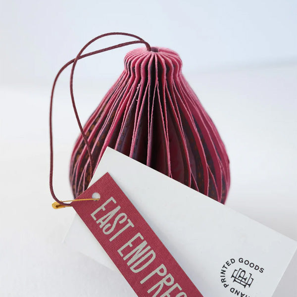 This elegant paper fig adds a soft, organic touch to your seasonal decor. Thoughtfully crafted from layers of recycled cotton paper, it opens into a beautifully sculpted three-dimensional honeycomb shape. Each piece is finished with a cotton hanging loop and secured with a subtle magnet, making it simple to open, close, and store. A single paper ornament that blends sustainable design with timeless charm.