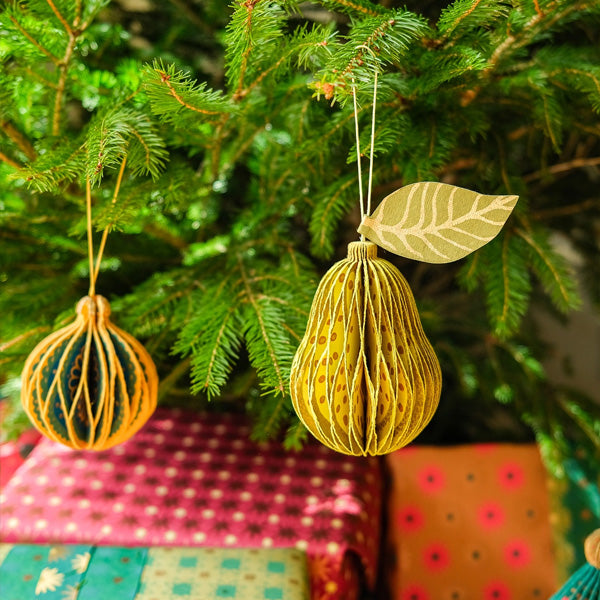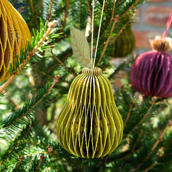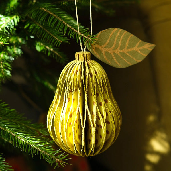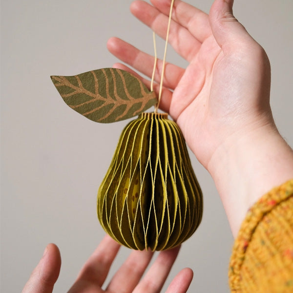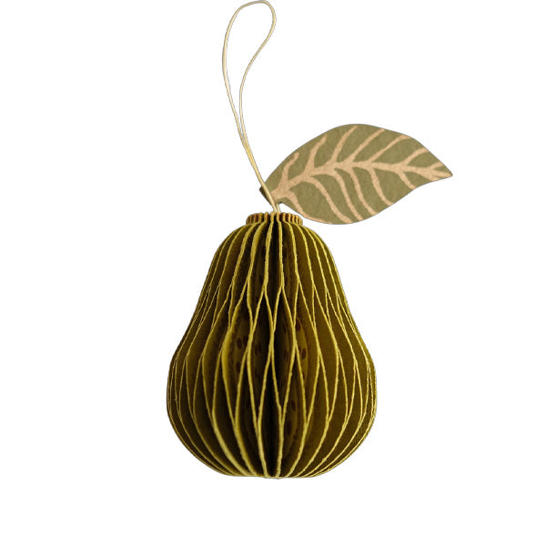 This elegant paper pear adds a soft, organic touch to your seasonal decor. Thoughtfully crafted from layers of recycled cotton paper, it opens into a beautifully sculpted three-dimensional honeycomb shape. Each piece is finished with a cotton hanging loop and secured with a subtle magnet, making it simple to open, close, and store. A single paper ornament that blends sustainable design with timeless charm.