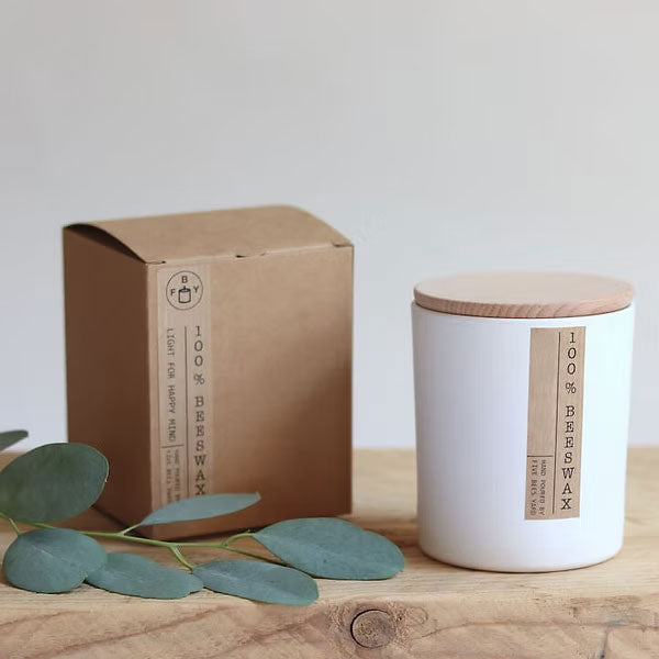 These naturally scented beeswax candles from Five Bees Yard are hand‑poured in their eco‑friendly apiary and presented in a clean white container with a wooden lid and kraft label, making them a thoughtful gift or a simple everyday luxury. Made with pure, natural beeswax and free from artificial colours, additives, and chemicals. Each candle arrives in a cardboard gift box, ready to enjoy. There are four fragrances to choose from: