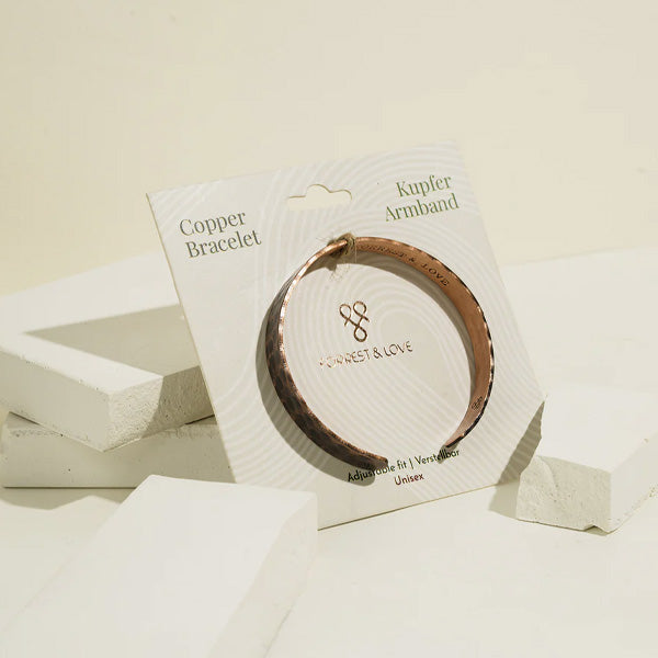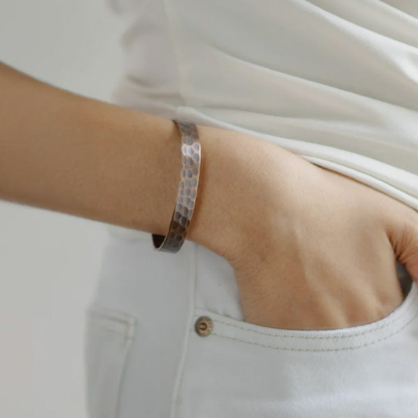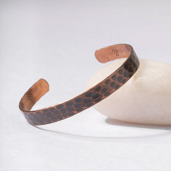 This classic hammered copper bracelet in an antique finish speaks of strength and individuality. Handmade from pure copper, this unisex bracelet is wearable wellness, thanks to copper’s grounding and energy balancing powers. Raw, timeless, and resonant for those who seek meaning in the details.