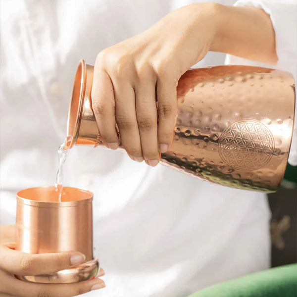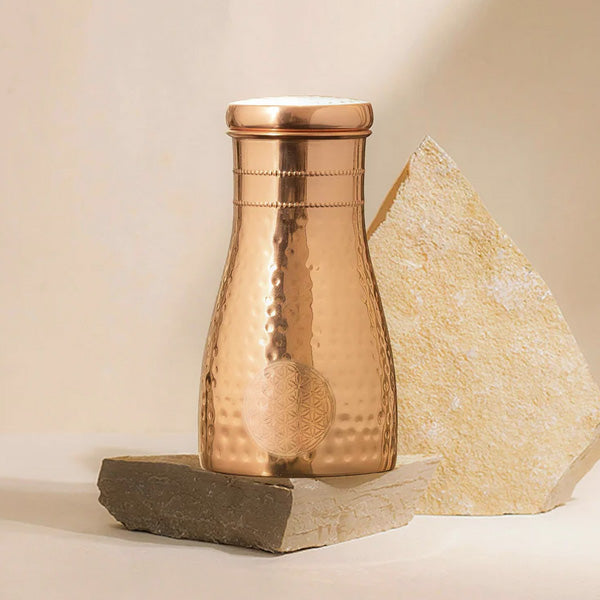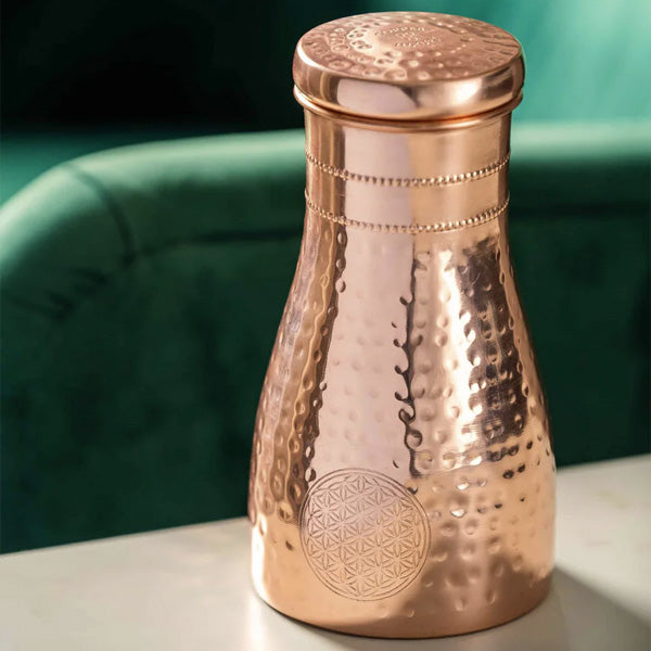 This elegant Flower of Life copper carafe with cup features a beautifully hand-hammered surface that not only catches the light but also echoes generational artisanal craftsmanship. It is ideal for Yoga studios, wellness spaces, spas, or mindful home rituals. Copper water bottles are not only beautiful and more sustainable than plastic, but are an important aspects of an Ayurvedic health routine. Studies also show that copper has anti-bacterial, anti-microbial and self-sterilising properties.