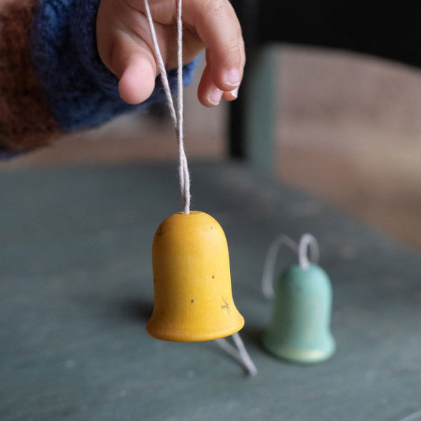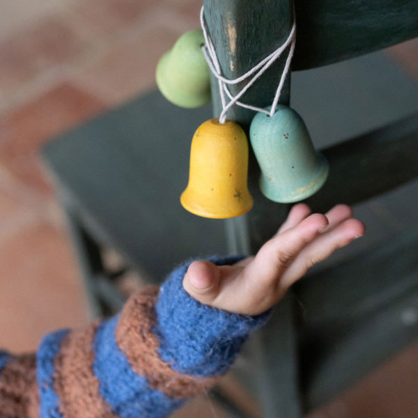 Sound the joyful bells! This sweet set of three wooden, hand-painted ornaments is perfect for little hands to hang on the tree, decorate a festive table, or use in imaginative play.