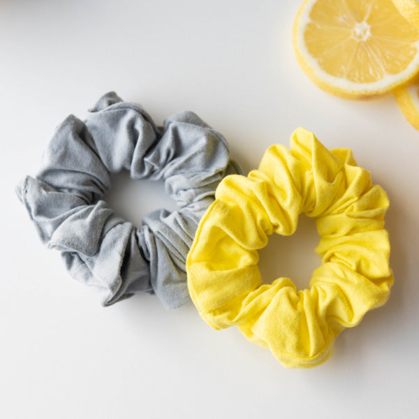 Brighten your day with this beautiful duo of Kooshoo scrunchies in warm yellow and soft grey, evoking the gentle hues of a morning sunrise. Made from breathable organic cotton and wrapped around a strong inner band of natural tree rubber, they offer all-day comfort and hold without pulling or damage. Ethically crafted, plastic-free, and biodegradable, these scrunchies are perfect for conscious consumers who want their accessories to reflect both their values and their style.