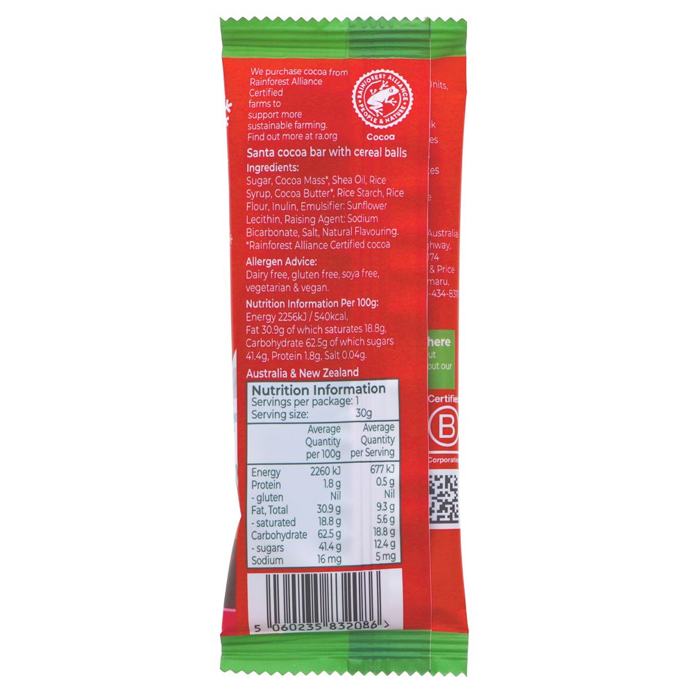 These scrummy little vegan and dairy free 'milk' chocolate Santa bars with light, crunchy and crispy cereal balls make perfect stocking fillers and Christmas treats. These Santa bars are made using Moo Free's ethical and vegan Rainforest Alliance chocolate, which means that by purchasing these Christmas chocolate Santas you are also helping to protect the planet.