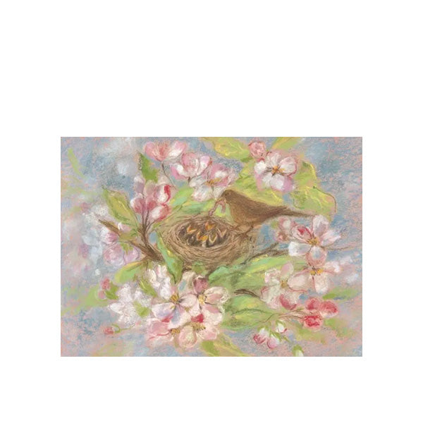 This pretty postcard brings a blackbird's busy day to life caring for hungry chicks nestled amongst the apple blossom. A lovely addition to your nature or seasonal table, or used simply as a postcard.