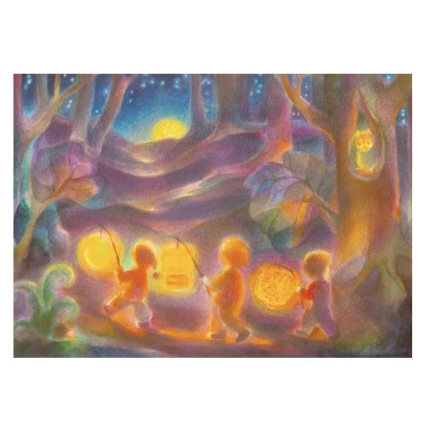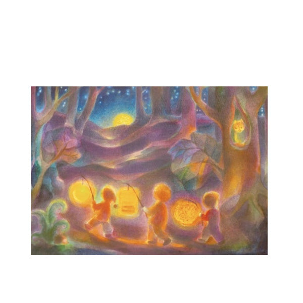 Step into a peaceful forest night with this enchanting postcard, featuring a child’s lantern-lit procession through autumn woodland, watched quietly by a curious owl. Painted in soft watercolours its dreamy tones and details evoke wonder and warmth, and the quiet excitement of exploring nature after dark. This postcard can be tucked into a bedtime story basket, added to seasonal displays, or sent to a friend with a cosy autumn greeting.