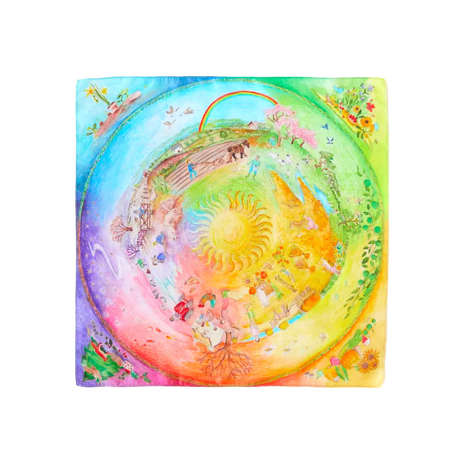 Celebrate the magic of the seasons with Sarah's Silks Around the Year On the Farm Mini Playsilk – a beautifully illustrated 53 x 53 cm square of luxurious, heavyweight 100% pure mulberry silk. From springtime blooms and buzzing summer bees to autumn’s golden harvest and the quiet charm of winter trees, this playsilk brings the rhythm of the farm to life. Designed to spark imagination and nourish the senses, Playsilks are endlessly versatile – perfect for dress-up, den-building, storytelling, or simply flowing through the air. Their open-ended nature encourages creative play and grows with your child, offering years of tactile joy and boundless possibilities. A timeless toy that’s as enchanting as it is enduring.