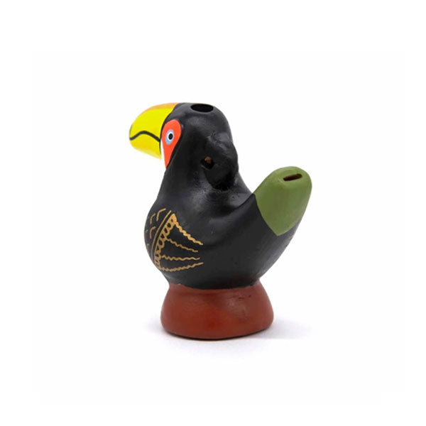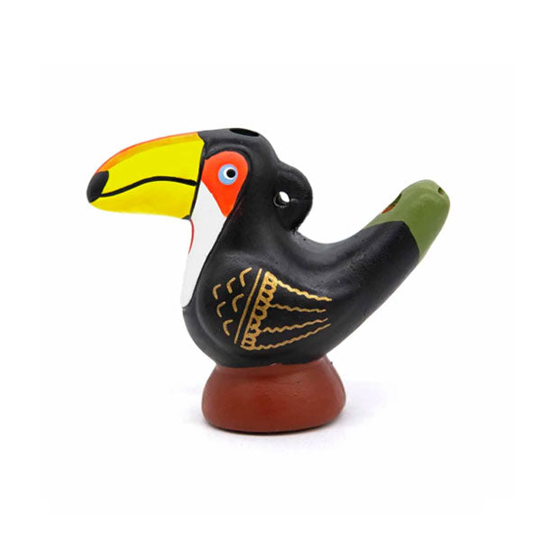 This cheeky toucan is a playful take on the classic Peruvian ocarina. Hand‑crafted from fired clay and painted in bright, vibrant colours, it is played by gently blowing through the tail hole and covering the head and tail holes to produce different notes and sounds. A joyful little instrument that’s perfect for curious kids.