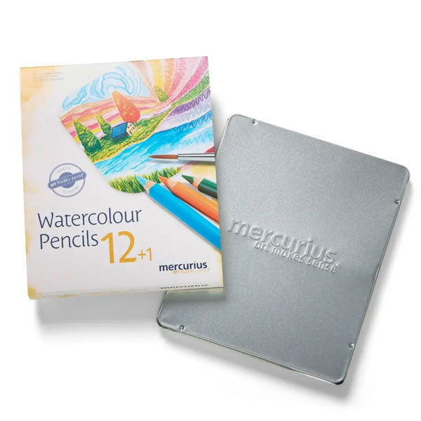 Tin box, 12 pencils + 1 paintbrush, length: 6.9 inch, diameter 0.39 inch, lead diameter 0.25 inch (length: 17.5 cm, diameter 10 mm, lead diameter 6.25 mm), 12 assorted colours.
